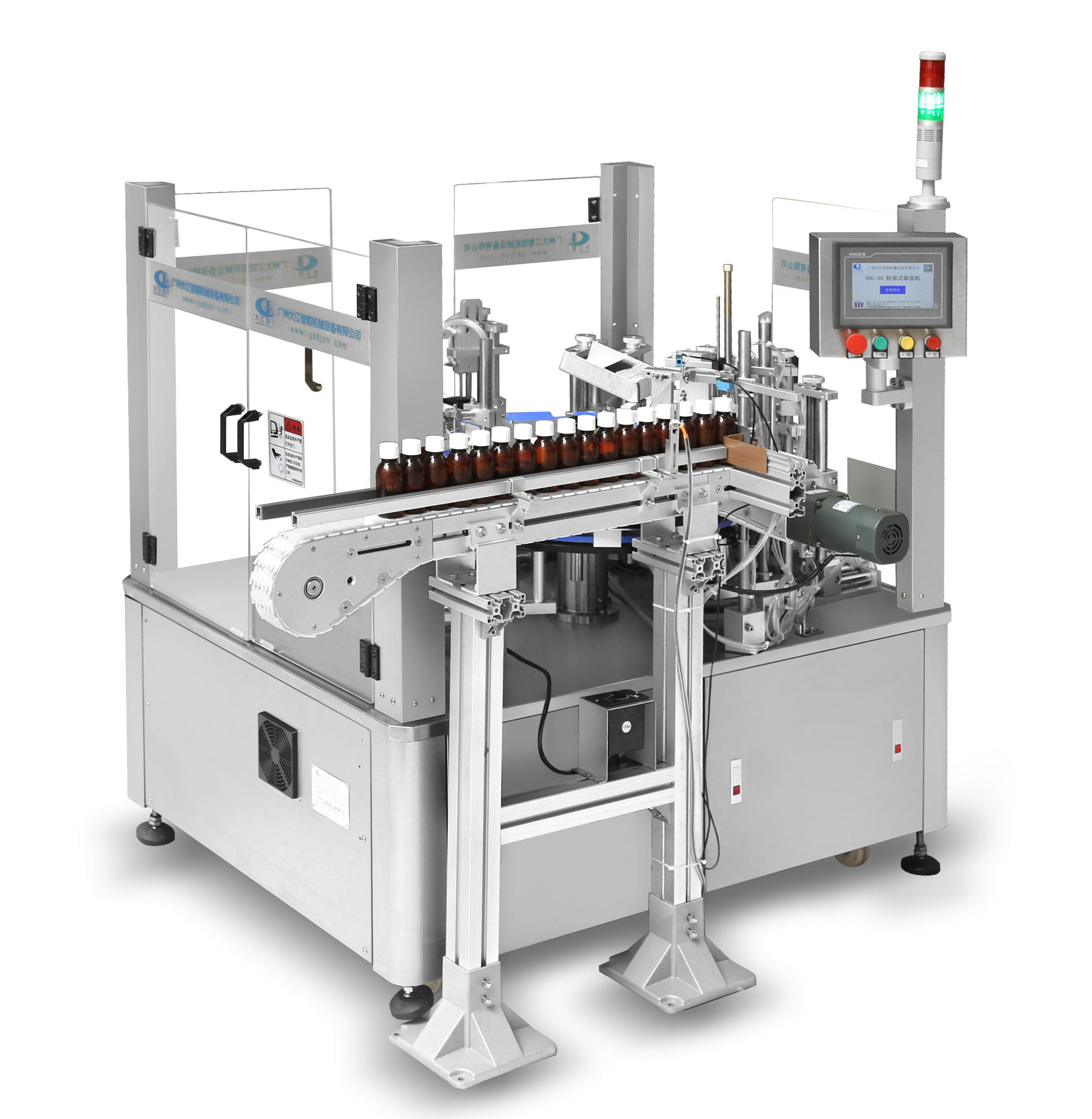DDU-1603 立式圓瓶定位貼標(biāo)機(jī) 適用范圍:用途廣泛!主要適用于醫(yī)藥、日化、食品等行業(yè)的圓柱形包裝容器或小錐度的圓錐形包裝容器的單標(biāo)、雙標(biāo)自動(dòng)定位貼標(biāo).該機(jī)拓展性強(qiáng)!可選配各類(lèi)打印機(jī)完成在線(xiàn)實(shí)時(shí)打印,可單機(jī)使用,亦能連接生產(chǎn)線(xiàn)使用 主要性能結(jié)構(gòu)特點(diǎn):1、中英文觸…