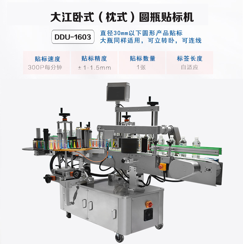 DDU-1604立式圓瓶貼標(biāo)機(jī) 適用范圍:用途廣泛!主要適用于醫(yī)藥、日化、食品等行業(yè)的圓柱形包裝容器的自動(dòng)貼標(biāo).該機(jī)拓展性強(qiáng)!可選配各類(lèi)打印機(jī)完成在線(xiàn)實(shí)時(shí)打印,可單機(jī)使用,亦能連接生產(chǎn)線(xiàn)使用主要性能結(jié)構(gòu)特點(diǎn):1、中英文觸控屏操作系統(tǒng),真正實(shí)現(xiàn)人機(jī)對(duì)話(huà),操作簡(jiǎn)單易學(xué)…