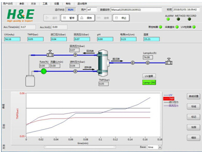 2)可設(shè)置進(jìn)料壓力、TMP及透過(guò)端UV報(bào)警值,超出范圍即停泵,防止目標(biāo)物損失,保證工藝可控性。