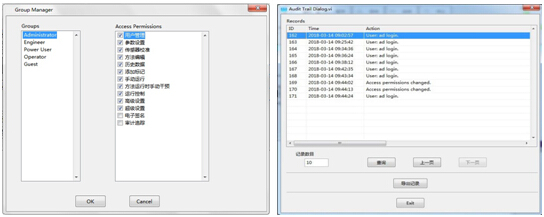 ? ? ??系統(tǒng)采用五級(jí)用戶管理權(quán)限,可對(duì)用戶權(quán)限進(jìn)行自定義分配,并可在運(yùn)行中更換用戶(便于交接班)。完善的審計(jì)追蹤及電子簽名功能,符合cGMP法規(guī)要求。