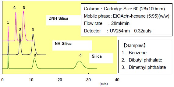 ? ?DNH硅膠鍵合的二元胺和一元胺是NH硅膠的2倍?;谶@個(gè)原因,DNH硅膠的堿度要比NH硅膠強(qiáng),并且由于碳鏈較長,DNH硅膠的氫鍵作用要比NH硅膠弱一些。因此,DNH硅膠的流動(dòng)相要選擇極性小的溶劑,因?yàn)镈NH硅膠的洗脫速度要比普通的裸硅膠和NH硅膠快。