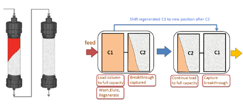 ??? ?? 傳統(tǒng)層析工藝,由于流穿效應(yīng),有30-50%的填料是無(wú)法被完全利用的,從而使得載量和處理量大為受限。Capture SMB用于優(yōu)化捕獲環(huán)節(jié),作為最簡(jiǎn)單和最優(yōu)化的2柱位設(shè)計(jì),可使純化效率顯著提高,并且使填料用量大為縮減。