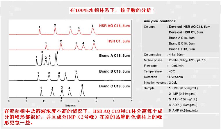 為了讓大極性的化合物在反相條件下有良好的保留,選擇一款可以用于100%水相的柱子是十分有必要的。尤其是HSR C1色譜柱,雖然其碳鏈短保留稍差,但是通過我們的合成技術(shù),它必將成為一款劃時代的色譜柱!