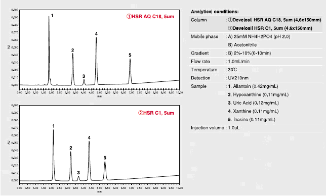 HILIC模式的柱子已經(jīng)有很多對極性化合物有良好保留的案例,但是,請嘗試一下Develosil的HSR系列色譜柱,你會發(fā)現(xiàn)這一系列柱子優(yōu)秀的的耐用性以及作為反相柱的便捷性。