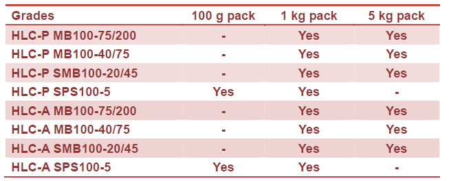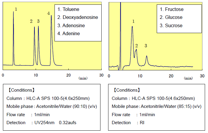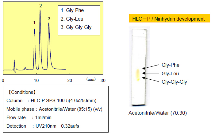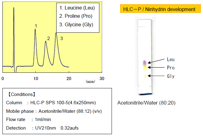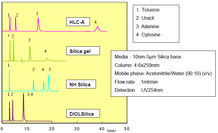 ????因此,對(duì)于極性化合物的洗脫,HILIC模式和反相模式是互補(bǔ)的。富士硅化學(xué)有限公司開發(fā)了兩款HILIC模式的填料,命名為“HLC”硅膠。兩種HLC硅膠都含有兩性的官能團(tuán),共價(jià)鍵合在硅膠表面?!?/span>HLC-A”用于分離純化有機(jī)酸、核酸和糖類;“HLC-P”用于分離氨基酸、多肽。