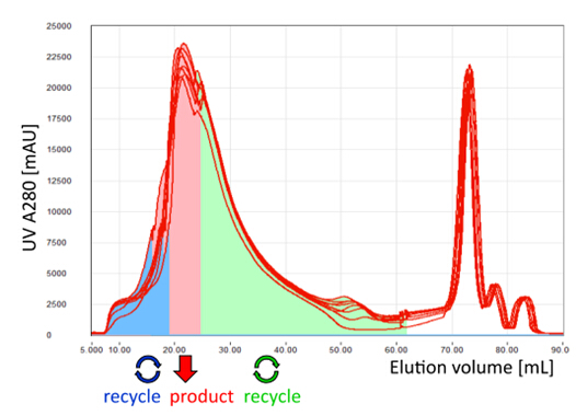 采用MCSGP,可將含有不純組分的產品回收再純化, 進行循環(huán)式的層析操作,從而最大限度地提純產品, 使得純度和收率二者兼得。