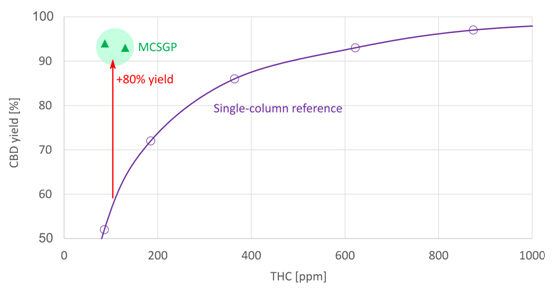 1. 在THC含量要求100 ppm時,MCSGP可使CBD收率提高80%左右;