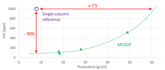 MCSGP可用于不同工藝要求。如果對目標產品的純度要求并不高,采用MCSGP可使產率進一步提高。比如某企業(yè)要求THC含量上限為1000 ppm時,收率水平不得低于85%,用MCSGP代替單柱層析后,產率由原來的8 g/L/h提高到了60 g/L/h以上。而另一工藝情況為,當從單柱層析轉換為MCSGP時,保持產率不變,雜質THC含量可從1000 ppm降低至100 ppm。見圖12純度 - 產率曲線。