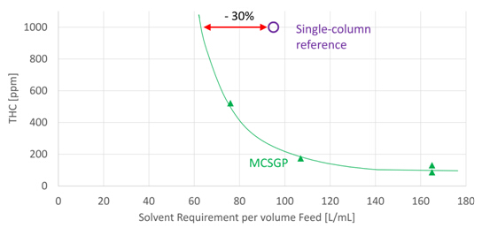 圖13顯示了單柱層析和MCSGP的溶劑消耗對比。在要求THC最大含量為1000 ppm時,MCSGP可使溶劑消耗量降低30%。單柱層析的溶劑消耗量為每mL上樣樣品消耗95 mL溶劑,而MCSGP的溶劑消耗量僅為每mL上樣樣品消耗65 mL溶劑。