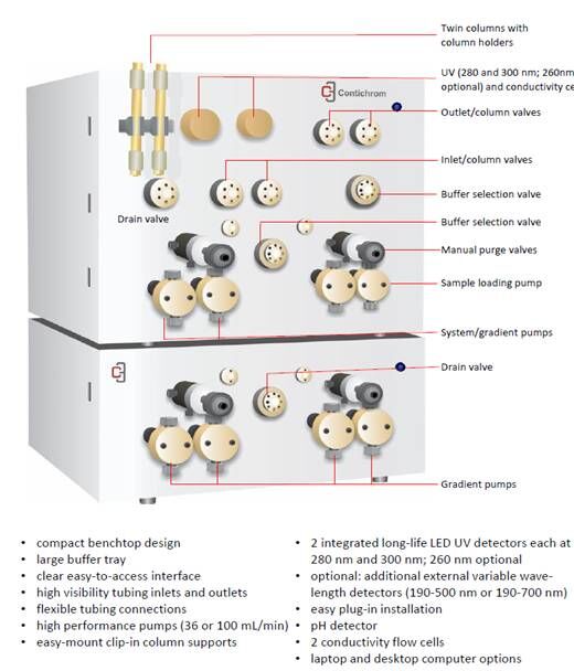 ChromaCon公司位于瑞士蘇黎世,是一家致力于層析設(shè)備及層析技術(shù)開發(fā)的企業(yè),其自主研發(fā)的Contichrom系列層析系統(tǒng),為一系列可用于連續(xù)純化的全自動(dòng)層析系統(tǒng)。