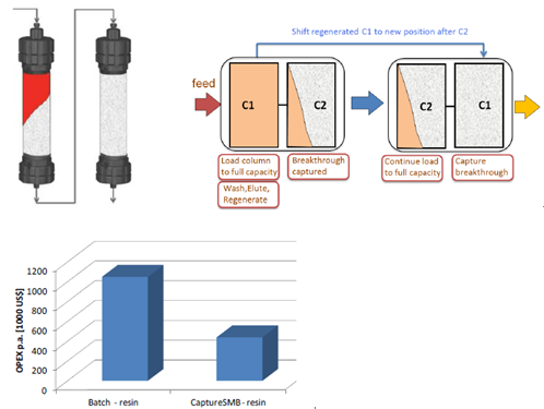 傳統(tǒng)層析工藝,由于流穿效應(yīng),有30-50%的填料是無法被完全利用的,從而使得載量和處理量大為受限。Capture SMB用于優(yōu)化捕獲環(huán)節(jié),作為最簡單和最強(qiáng)大的2柱位設(shè)計(jì),可使純化效率顯著提高,并且使填料用量大為縮減。
