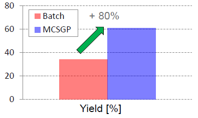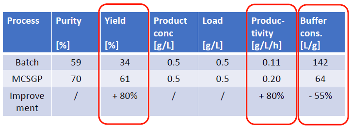 有案例證明,MCSGP可將產(chǎn)品純度從傳統(tǒng)工藝的59%提升至70%,將收率從傳統(tǒng)工藝的34%提升至61%,從而使產(chǎn)量(g /L /h)整體提升80%,并同時(shí)使Buffer的消耗量降低55%。MCSGP工藝,無疑可顯著地節(jié)約成本投入,并可產(chǎn)生更多的生產(chǎn)效益。