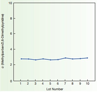 上圖所示,顯示了對羥基苯甲酸甲酯/2,6-二甲基吡啶(Methylparaben/2,6-Dimethylpyridine)YMC-Pack ODS-AM液相色譜柱上10次的分離因子(α)。YMC公司在生產(chǎn)過程中采用的嚴格質(zhì)量控制體系,以保證產(chǎn)品生產(chǎn)批間的差異最小,提供高再現(xiàn)性的堿性化合物分析柱。